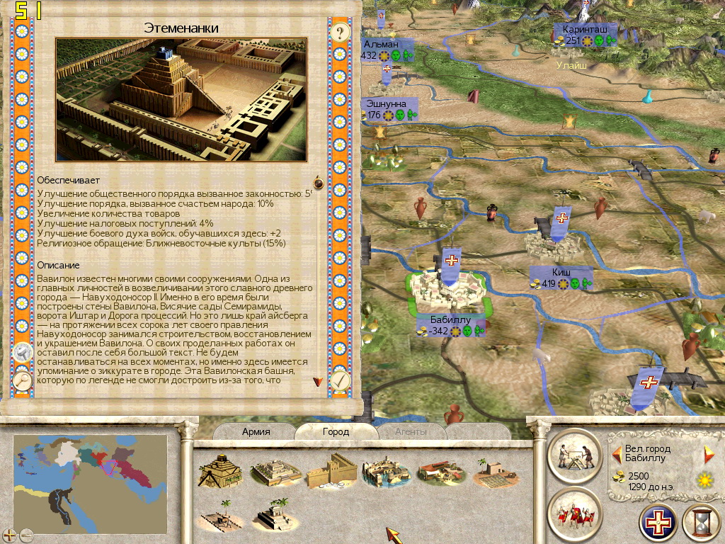 Нет нужды подробно расписывать, как добавлять новое здание, делать его не разрушаемым, уникальным (то есть без возможности строительства в обычной строительной ветке) и имеющим определённые бонусы. Для этого существуют множество туторов, в том числе и на нашем форуме. Мы лишь несколько изменим эту технологию и добавим в блюдо пару новых ингридиентов - разность культур и хидден-ресурсы (скрытые ресурсы, прописываемые в файлах descr_regions и export_descr_building). Для начала нужно определиться, что и где вы хотите создать, и главное помнить - постройки должны принадлежать к разным культурам.